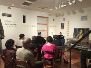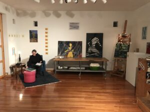 Ace Zappa is used Studio Residency to compile a book of their poetry, carve and print lino blocks to go with each poem, and hand print a limited edition. The book is currently called “wishbook-workbook-makebook.” Ace shared about their textile work and paintings as well.