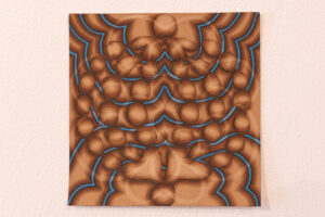 Powell exhibited her work and gave an artist talk at the end of her residency. Her work wass comprised of abstract shapes and patterns. During the pandemic, she largely focused on creating small paintings because of limited studio space and a desire for easily portable materials. She used the residency at Surel’s Place to explore how her individual works of art can exist on a larger scale, focusing on two larger canvases. This continued expansion is fitting since this work developed during one of the most constricting situations imaginable: while she was immobilized during an illness. Experiencing physical limitations, she instinctively began to draw and abstract the shape of her own body to reconnect with it and to reclaim it.