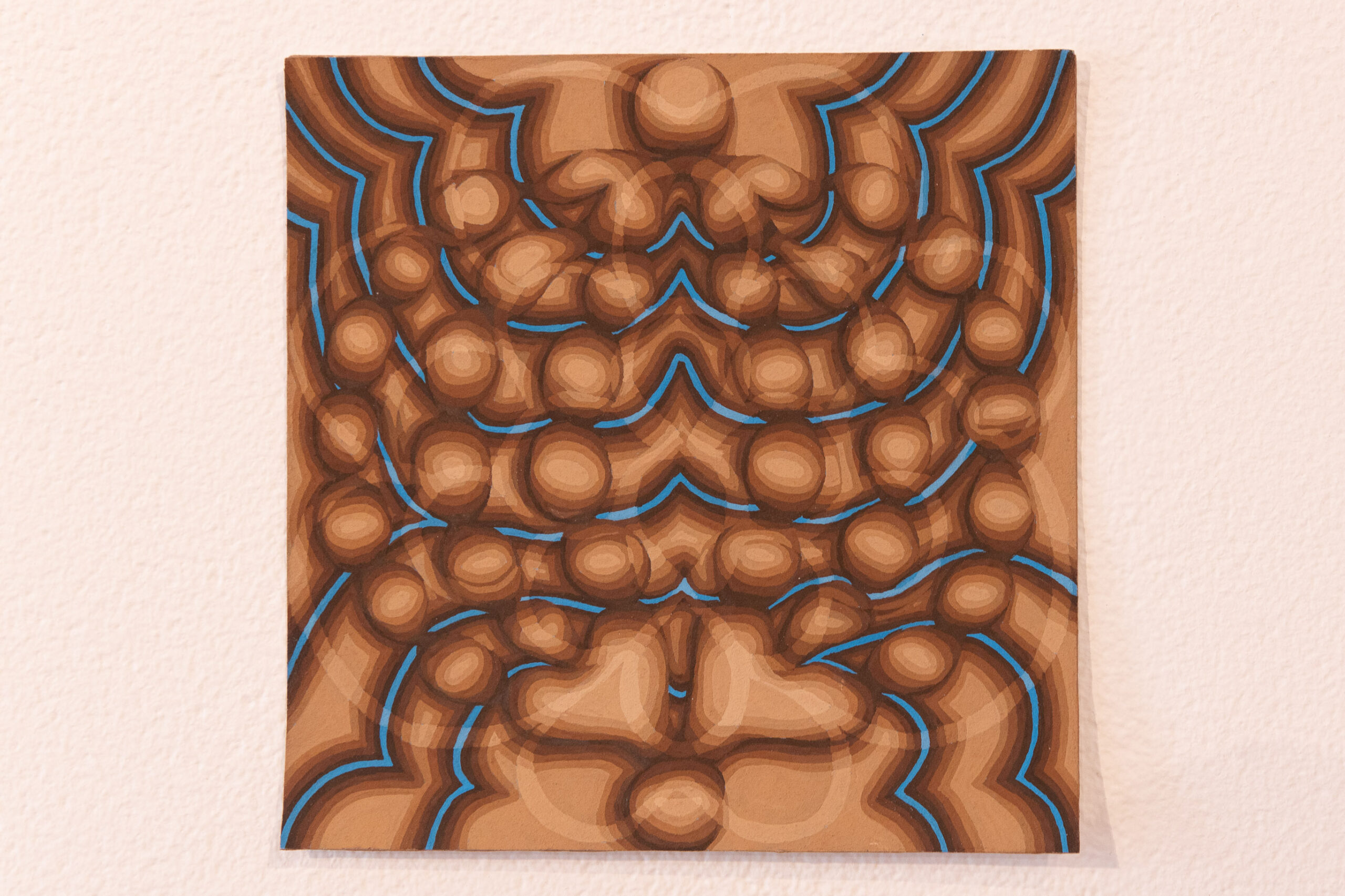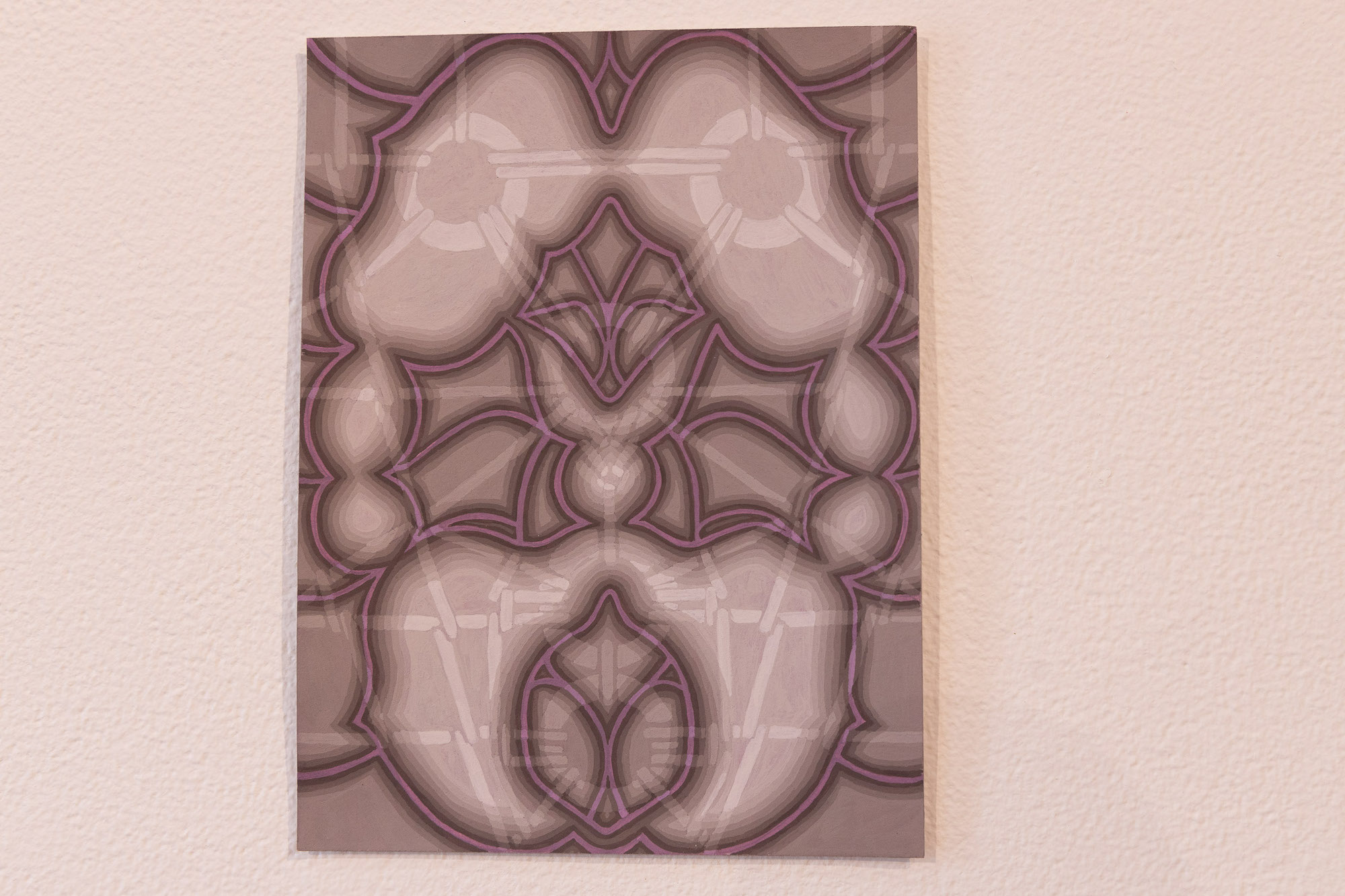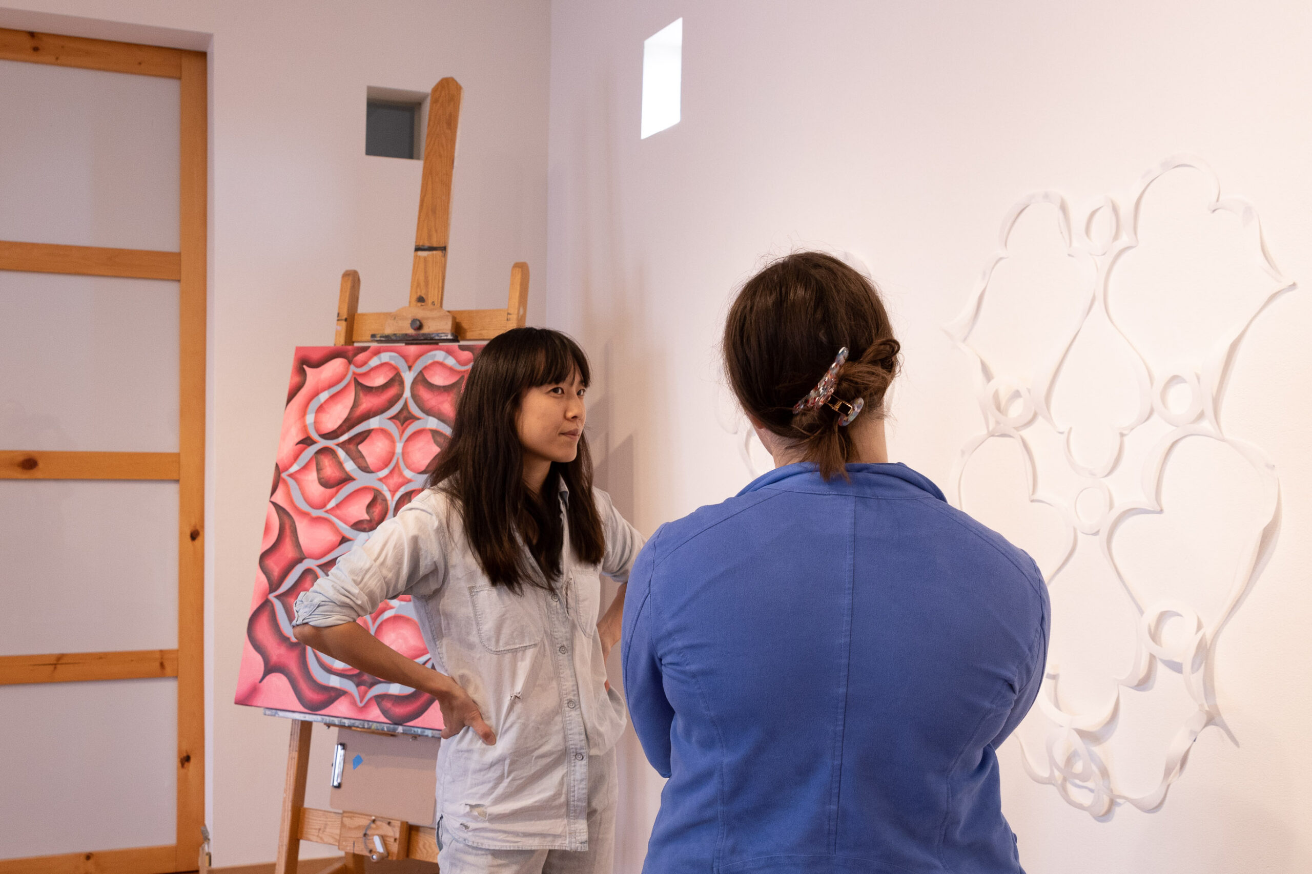 Powell exhibited her work and gave an artist talk at the end of her residency. Her work wass comprised of abstract shapes and patterns. During the pandemic, she largely focused on creating small paintings because of limited studio space and a desire for easily portable materials. She used the residency at Surel’s Place to explore how her individual works of art can exist on a larger scale, focusing on two larger canvases. This continued expansion is fitting since this work developed during one of the most constricting situations imaginable: while she was immobilized during an illness. Experiencing physical limitations, she instinctively began to draw and abstract the shape of her own body to reconnect with it and to reclaim it.