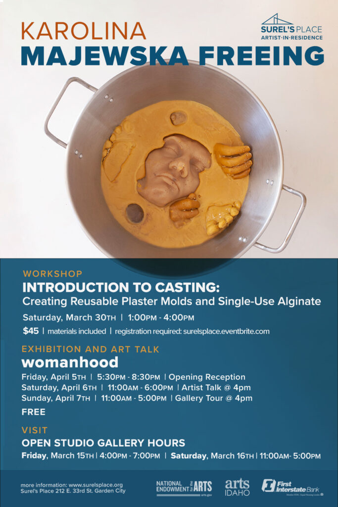 Karolina led an introduction to casting work shop on how to create reusable plaster molds and single use alginate. “The process of casting my body has given me the perspective to self-observe and accept the mortality of my physical form,” she says. During her residency at Surel’s Place, she created intimate, imperfect self-portraits using casting techniques to build installations that are also metaphors for the body of a woman. Her exhibition, womanhood, was on view from April 5th-7th.