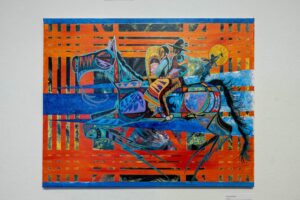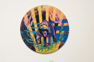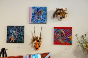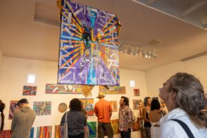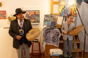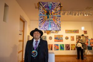 On June 21st and 22nd, 2024, he held an open studio at Surel’s Place, inviting the public to see the work-in-progress he was developing for his exhibition. On June 23rd, he hosted a sold-out painting workshop introducing participants to his style of textural painting. His exhibition Yooti (Yo-di) – To Rise in Culture Abstracted, was open July 8th – 10th. Kit gave an artist talk and performed a closing song with his son Caylon Hedgepeth.