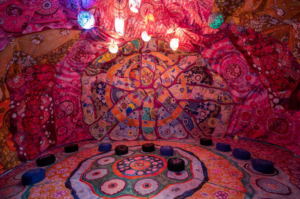 Laurie Shapiro is a visual artist whose work employs a layering technique that combines painting, screen-printing, sewing, and sculpture to create all-encompassing, visually stimulating installations and individual pieces. The environments she creates transports viewers into psychedelic womb-like environments: handcrafted, vibrant, and filled with patterns and colors that invite interaction and meditation. Laurie was born with a condition that causes progressive deafness as she ages, muting her experience of the outer world while her inner world is amplified. These internal emotional experiences manifest as vibrant and captivating visuals, enveloping viewers in a realm of color and wonder. Paintings are particularly expressive, with subjects often using exaggerated gestures to communicate. Laurie primarily understands the world through visual stimuli and internal feelings, and this, in turn, colors all of her work. Central to her artistic practice are screen-printed floral patterns and imagery—drawings of plants that “speak” to her. Heavily informed by her internal and spiritual experiences, Laurie’s work urges viewers – in a time of climate devastation – to listen not through noise but through feeling and intuition.