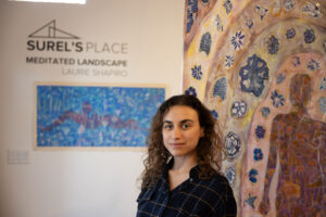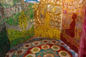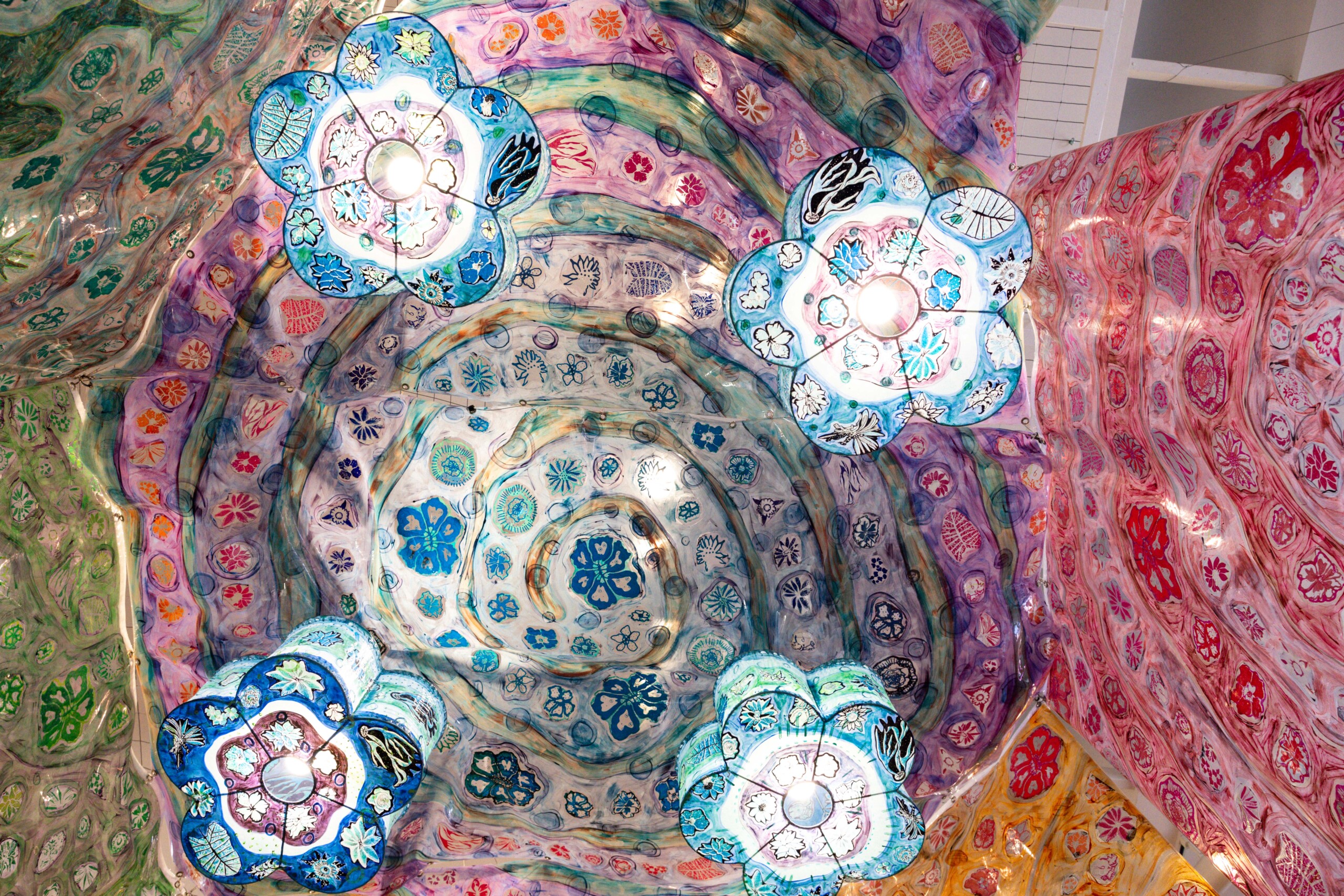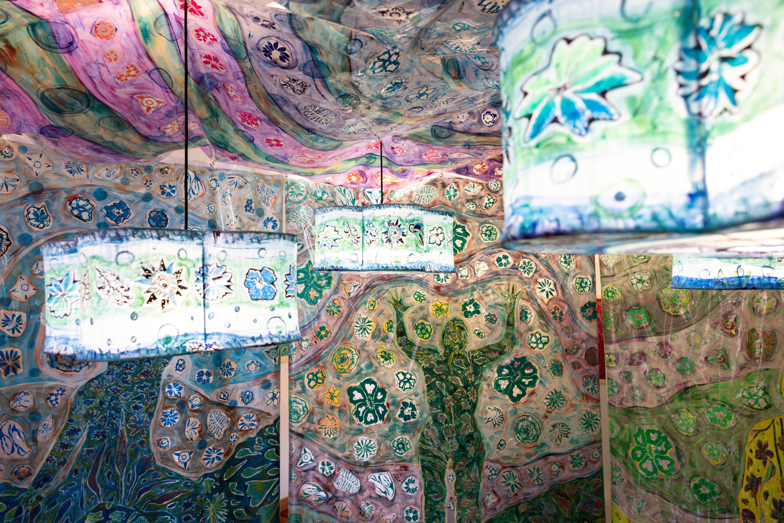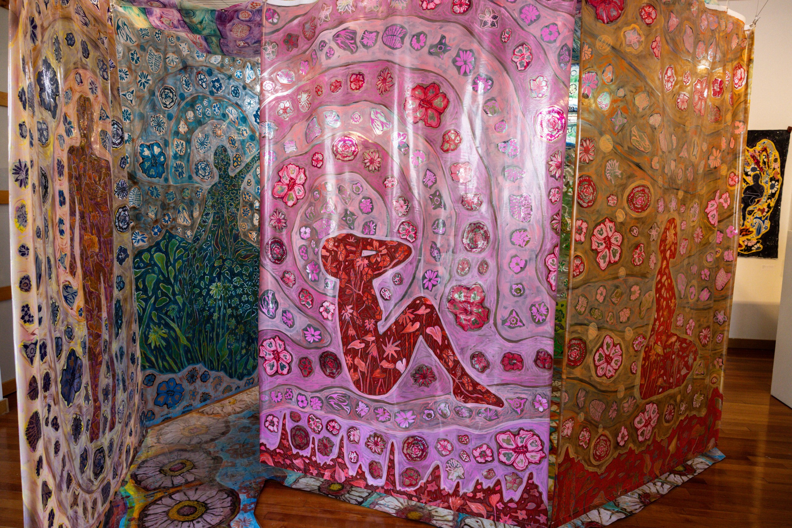 Laurie Shapiro is a visual artist whose work employs a layering technique that combines painting, screen-printing, sewing, and sculpture to create all-encompassing, visually stimulating installations and individual pieces. The environments she creates transports viewers into psychedelic womb-like environments: handcrafted, vibrant, and filled with patterns and colors that invite interaction and meditation. Laurie was born with a condition that causes progressive deafness as she ages, muting her experience of the outer world while her inner world is amplified. These internal emotional experiences manifest as vibrant and captivating visuals, enveloping viewers in a realm of color and wonder. Paintings are particularly expressive, with subjects often using exaggerated gestures to communicate. Laurie primarily understands the world through visual stimuli and internal feelings, and this, in turn, colors all of her work. Central to her artistic practice are screen-printed floral patterns and imagery—drawings of plants that “speak” to her. Heavily informed by her internal and spiritual experiences, Laurie’s work urges viewers – in a time of climate devastation – to listen not through noise but through feeling and intuition.