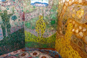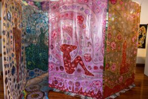 The central (work-in-progress) installation piece in this room, “Transcendence of Pain,” reflects this realization. During my drive to Boise, I attended a meditation retreat and cried for three days. I cried and cried, but sometimes the tears stopped, and I reassured myself that this pain would be insignificant one day as all things pass. This installation piece results from my year-long journey, delving into the feminine divine in Italy, exploring tropical plant life in Mexico, and rediscovering self-love in Finland. As I drove through mountains, I observed how the scenery changed, how distant objects appeared closer, and how everything is in constant flux. Life is constantly changing, and nothing is permanent. So, I invite you to meditate on this moment and immerse yourself in the art with me.”