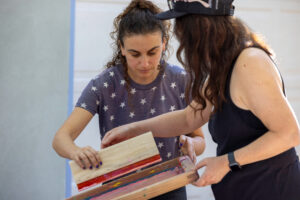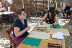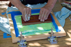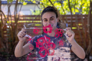 During her residency Laurie led two workshops. The first was an Introduction to Screen Printing. Using premade designs by the artist, participants had the opportunity to print on both fabric and paper. They also had the option to create their own designs using a cut paper technique. The second was an embroidery workshop where participants were invited to bring their own item, such as a jacket or shirt, to embroider with a design of their choice.