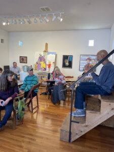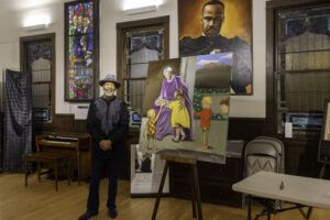 Marshall describes his work as autobiographical. “My own style is blended with traditional techniques to create an enriched view of the life I’ve experienced. I placed myself in the scene along with other characters from my life. I am taking a look at the positives in everyday life; the perspectives, traditions, and routines of being outside of the struggles.”