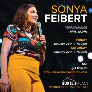 Sonya Feibert Kuhn (she/her) is a storyteller, writer, improviser, and comedy enthusiast. In addition to humor writing, she performs typewriter poetry, listening to people’s stories to inspire live poems, written on the spot. Like a true Gemini, Sonya has her hand in a lot of cookie jars but only eats the ones with chocolate chips. She won first place in a fiction contest and was an extra on Portlandia but her true claim to fame is being able to raise each eyebrow independently.